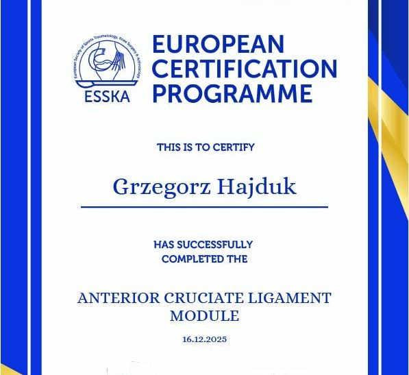 Po kilkunastu miesiącach intensywnej nauki, wymagających egzaminach teoretycznych i praktycznych zakończyłem europejską certyfikację z rekonstrukcji więzadła krzyżowego przedniego (ACL).