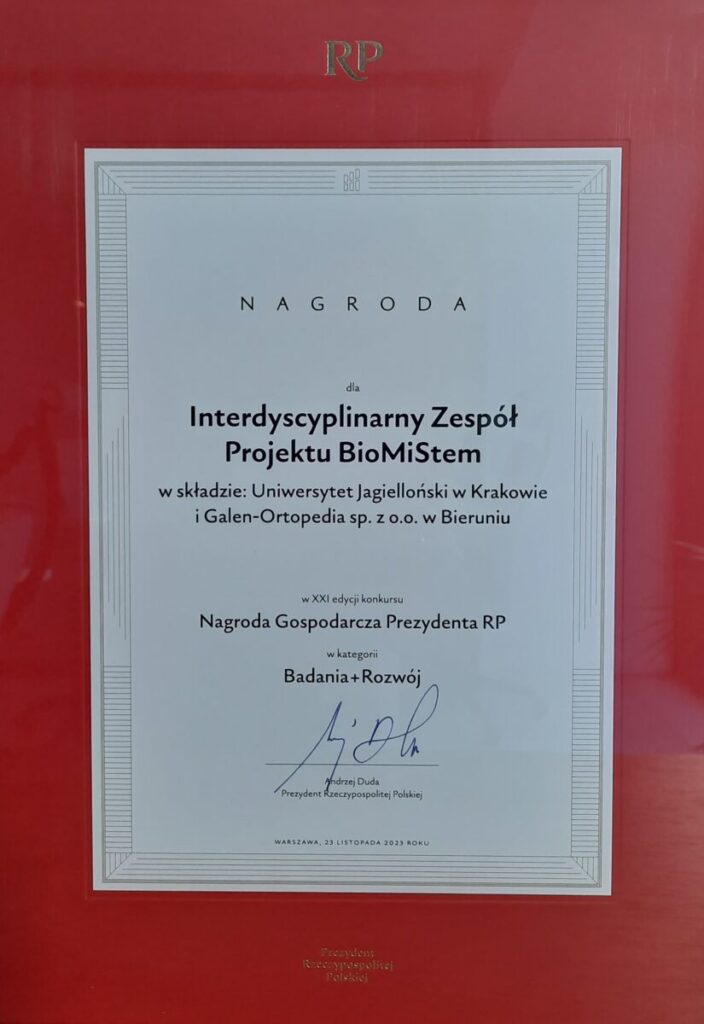 Interdyscyplinarny Zespół Projektu BioMiStem, który stworzony został przez pracowników Galen-Otopedia Sp. z o.o. wraz z Uniwersytetem Jagiellońskim otrzymał Nagrodę Gospodarczą Prezydenta RP w kategorii Badania+Rozwój za opracowanie nowego „leku komórkowego” pod nazwą MesoCellA-Ortho.